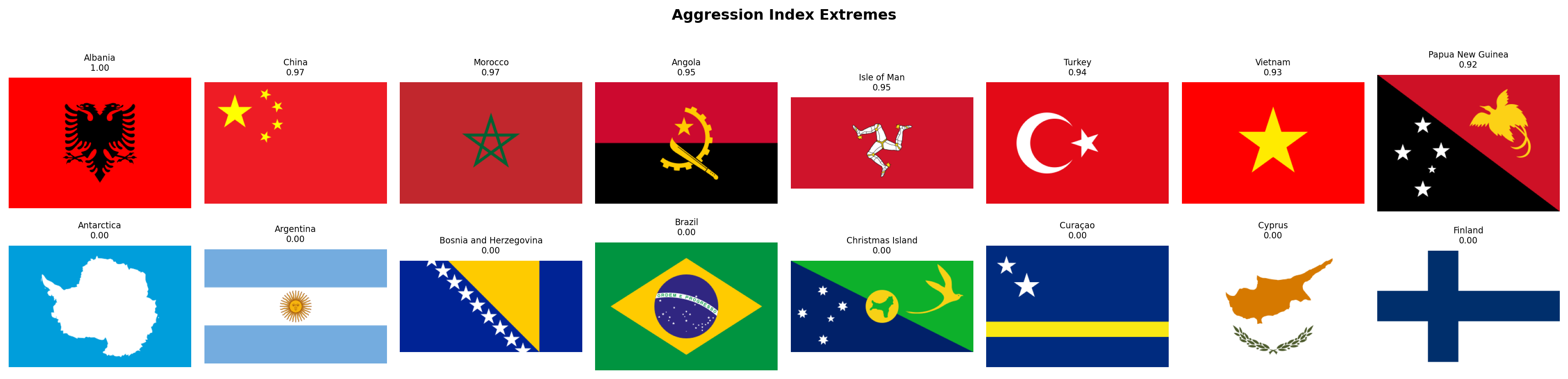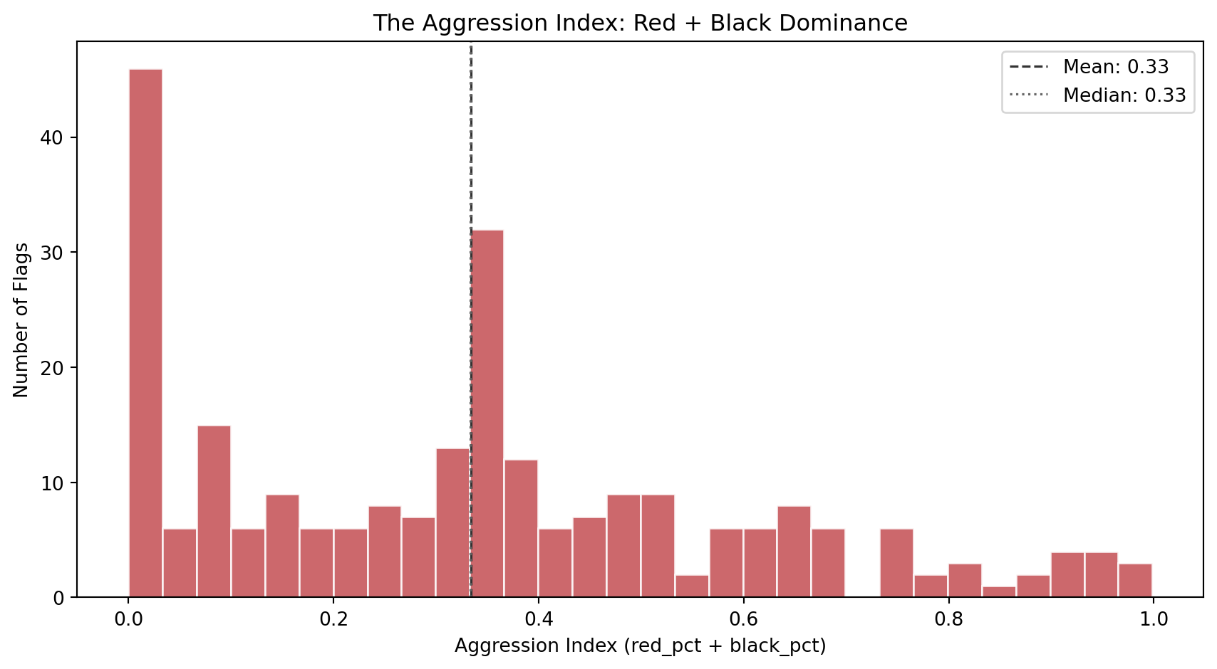 - **Life expectancy and temperature vs. aggression**: Both null (|ρ| ~ 0.11, p > 0.05). Hot countries do not have more aggressive flags. Long-lived countries do not have calmer flags. The aggression index does not correlate meaningfully with any external variable except population (ρ = +0.23).
