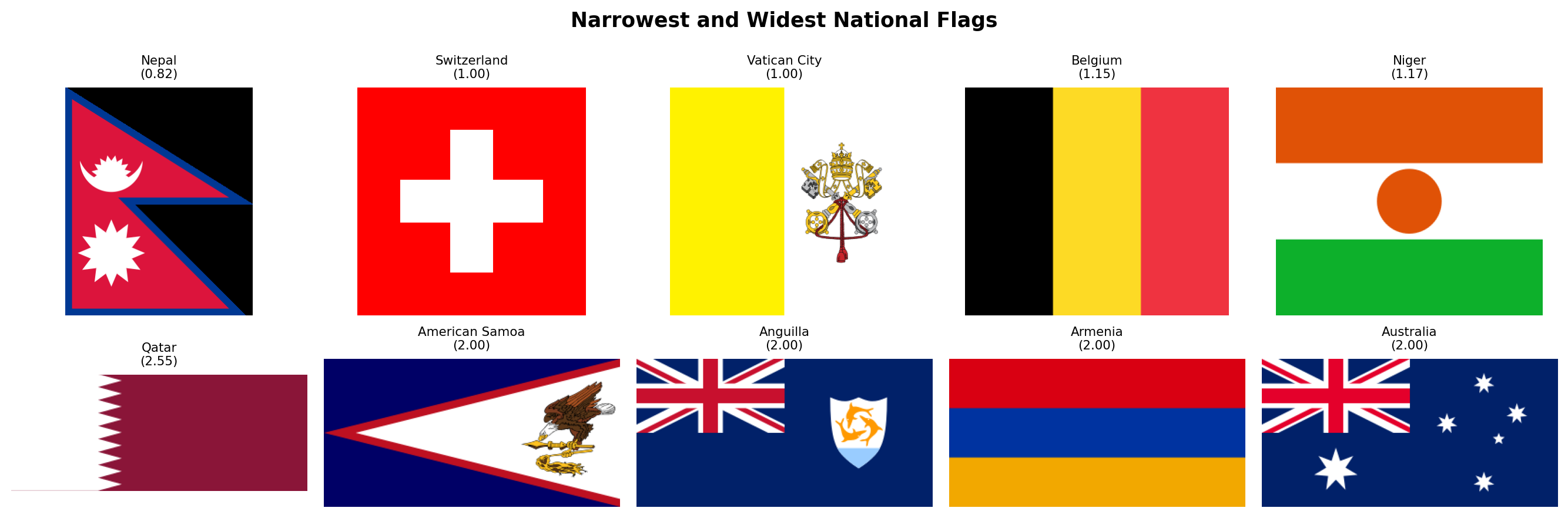 We download flags in **SVG** (Scalable Vector Graphics) rather than PNG. SVGs encode colors as exact hex values and shapes as mathematical paths, which means our color analysis operates on precise definitions rather than compression artifacts. When pixel-level processing is needed later (for neural networks, for instance), we rasterize the SVGs at a controlled resolution using `cairosvg`.
