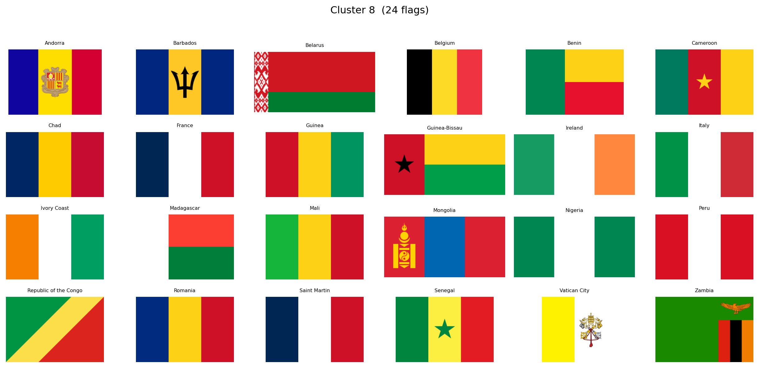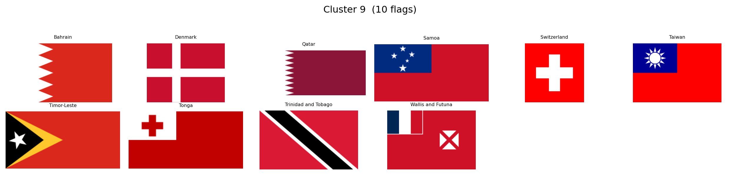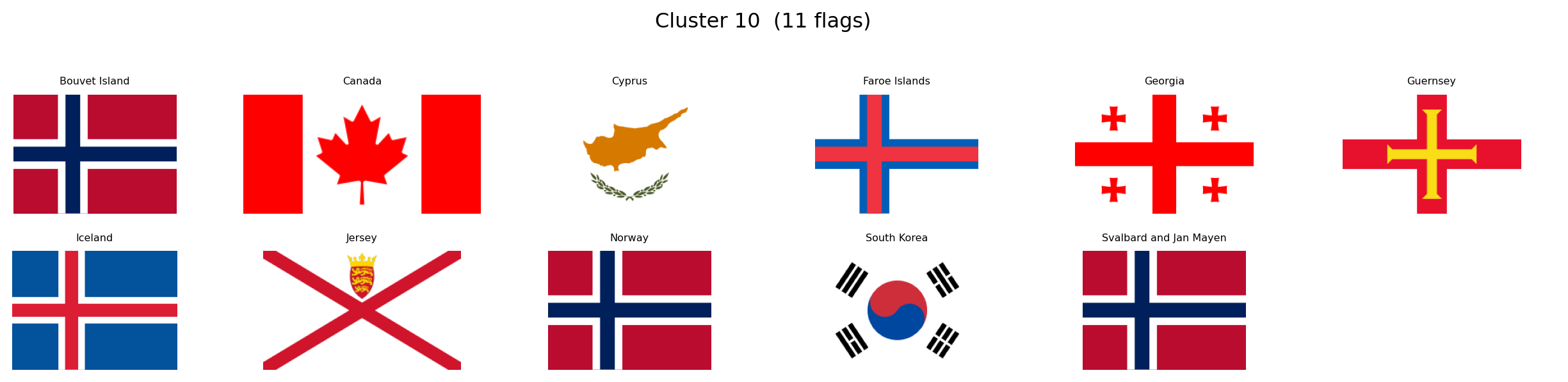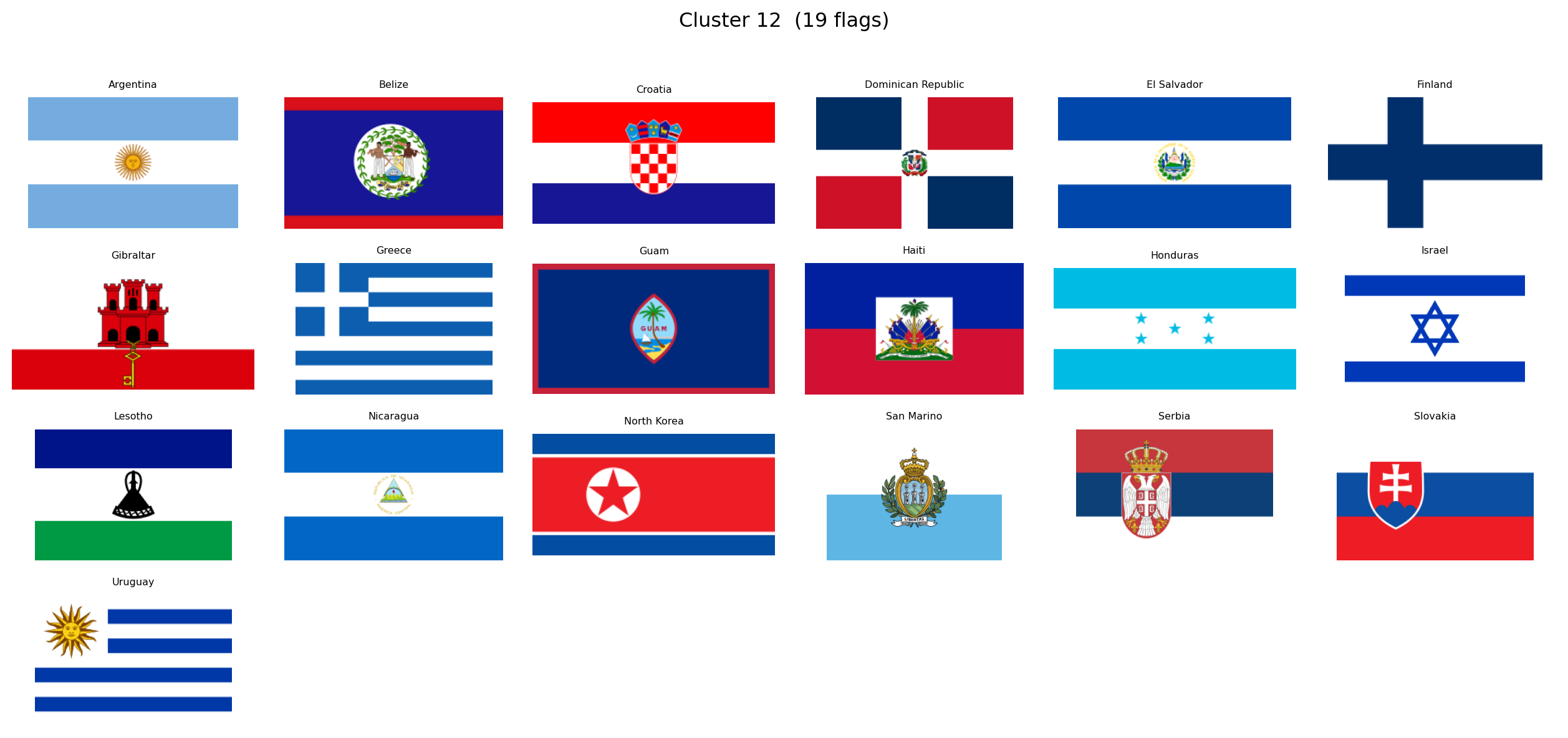 **Stage 2: Structure discovery.** In this notebook, we computed pairwise distances between all 250 flags using both hand-crafted features and deep learning embeddings from ResNet-50. UMAP projected the resulting space into two dimensions, revealing a landscape where Pan-African tricolors cluster away from Nordic crosses, and the blue ensigns of former British territories form their own archipelago. HDBSCAN identified 12 stable clusters, with roughly 70% of flags assigned to a group and the remainder classified as noise, flags too unique to fit neatly into any family.