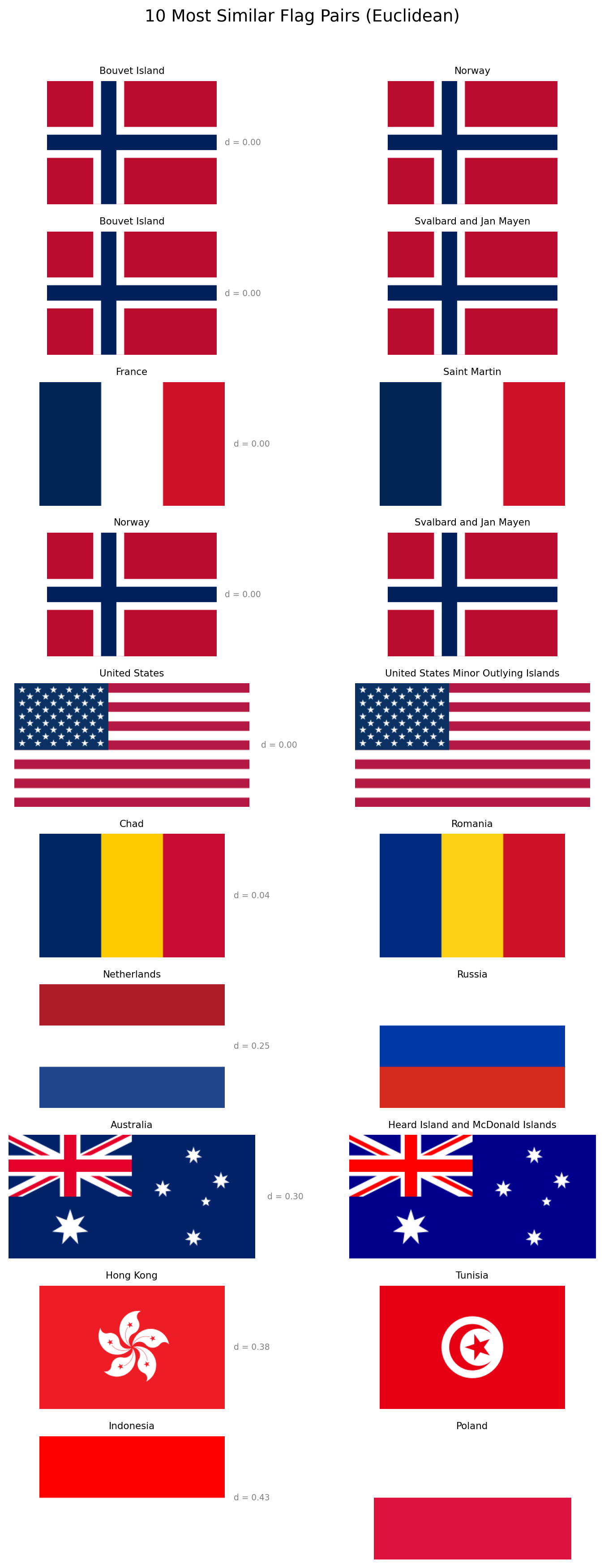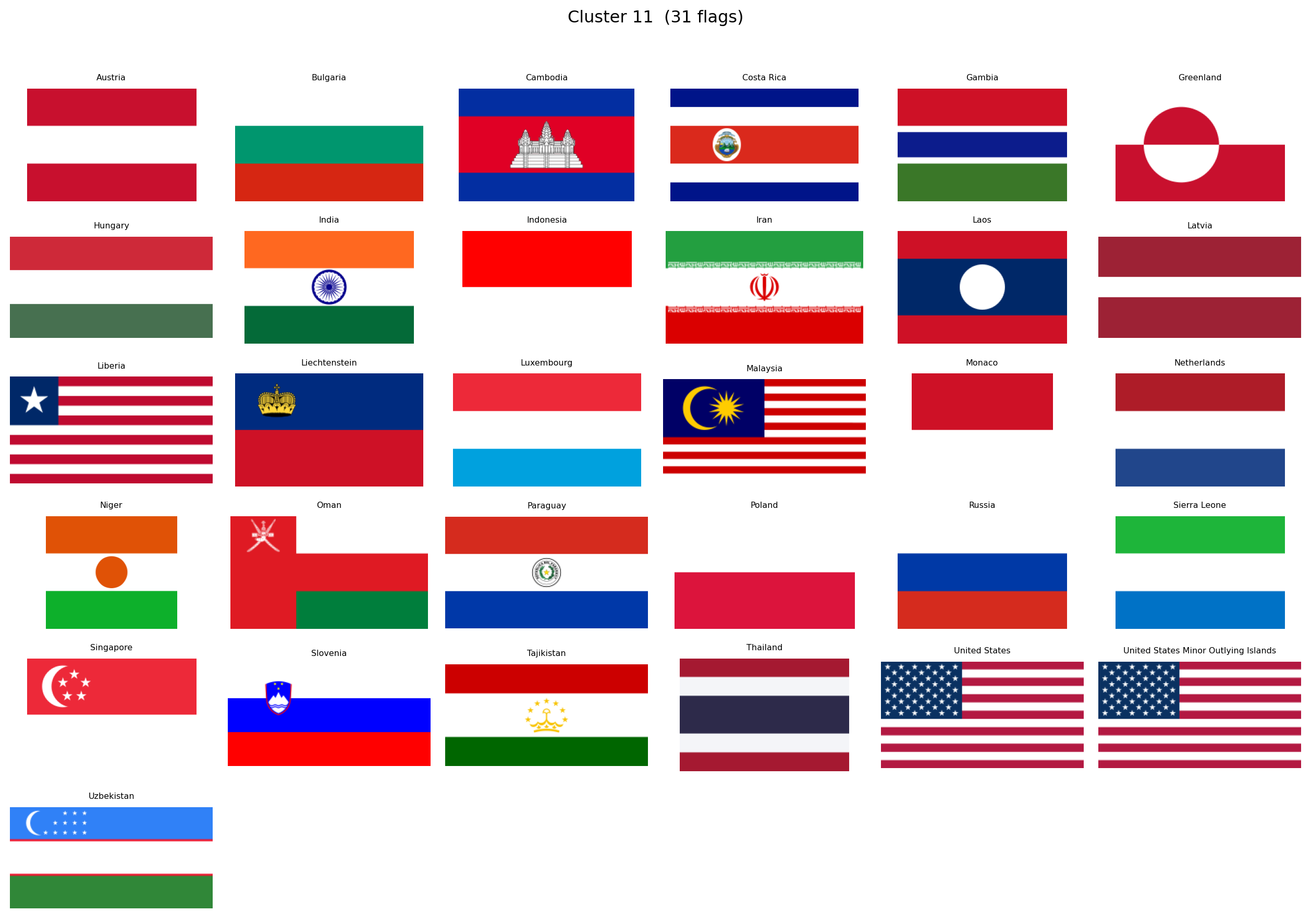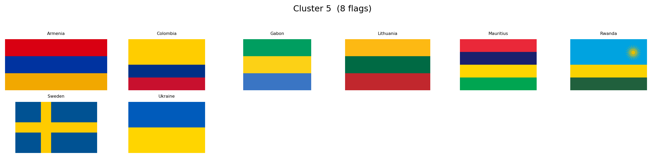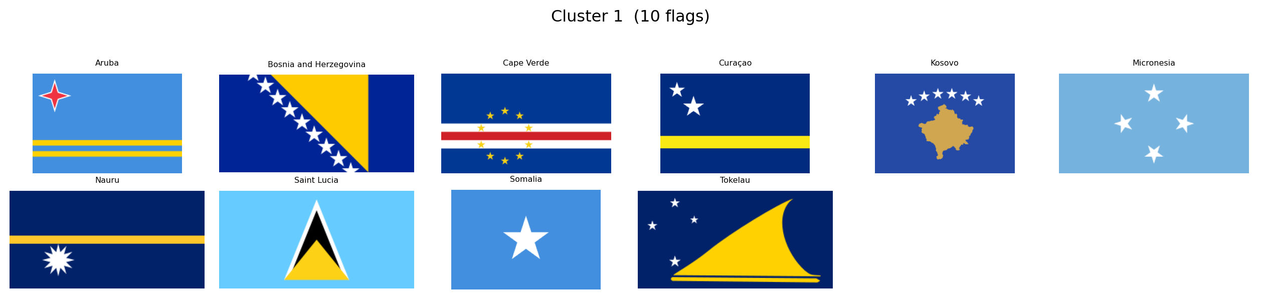 **Stage 2: Structure discovery.** In this notebook, we computed pairwise distances between all 250 flags using both hand-crafted features and deep learning embeddings from ResNet-50. UMAP projected the resulting space into two dimensions, revealing a landscape where Pan-African tricolors cluster away from Nordic crosses, and the blue ensigns of former British territories form their own archipelago. HDBSCAN identified 12 stable clusters, with roughly 70% of flags assigned to a group and the remainder classified as noise, flags too unique to fit neatly into any family.