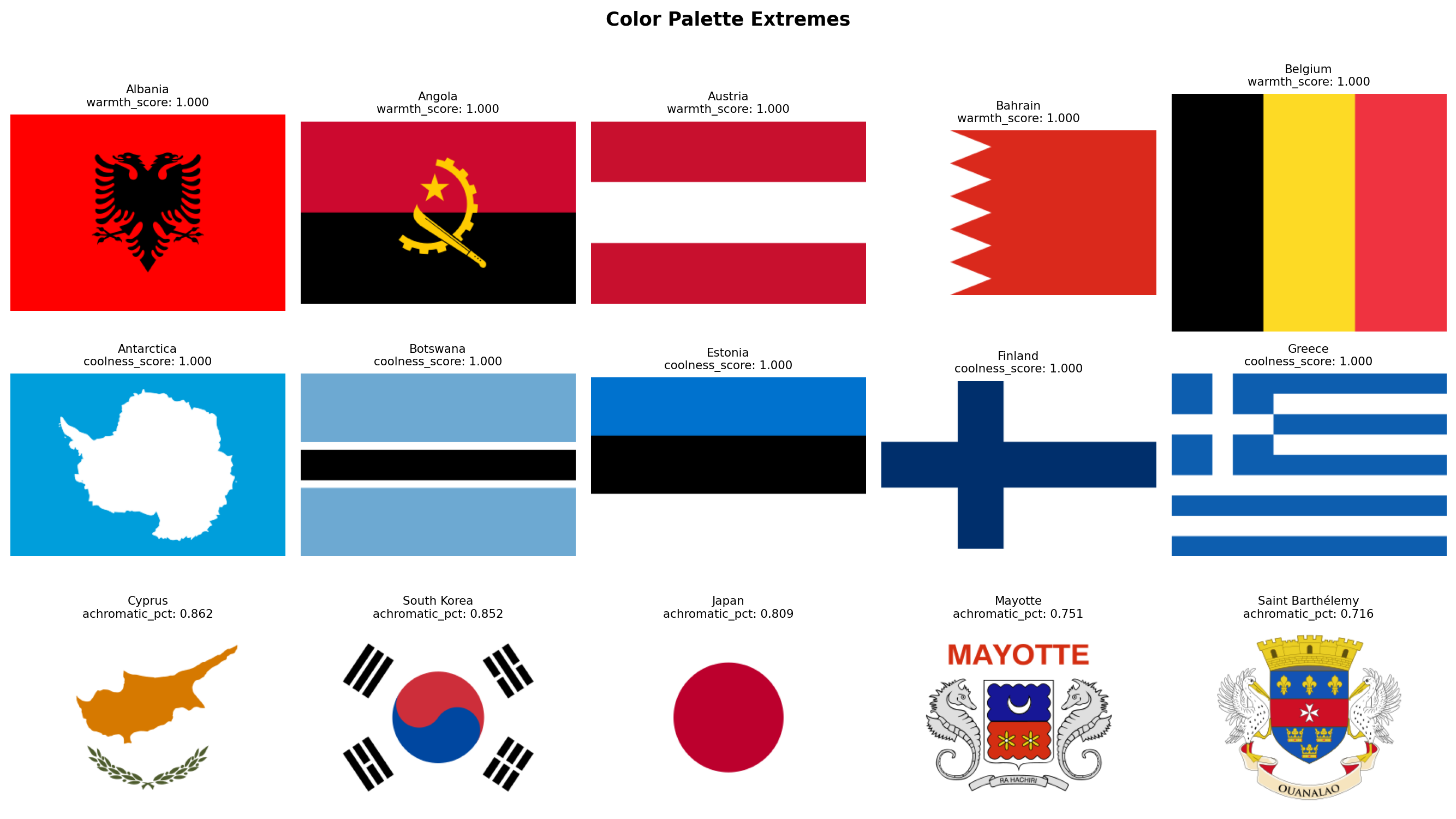 - **Solar Determinism**: do countries closer to the equator use "hotter" colors (reds, yellows) while northern nations prefer cooler palettes?